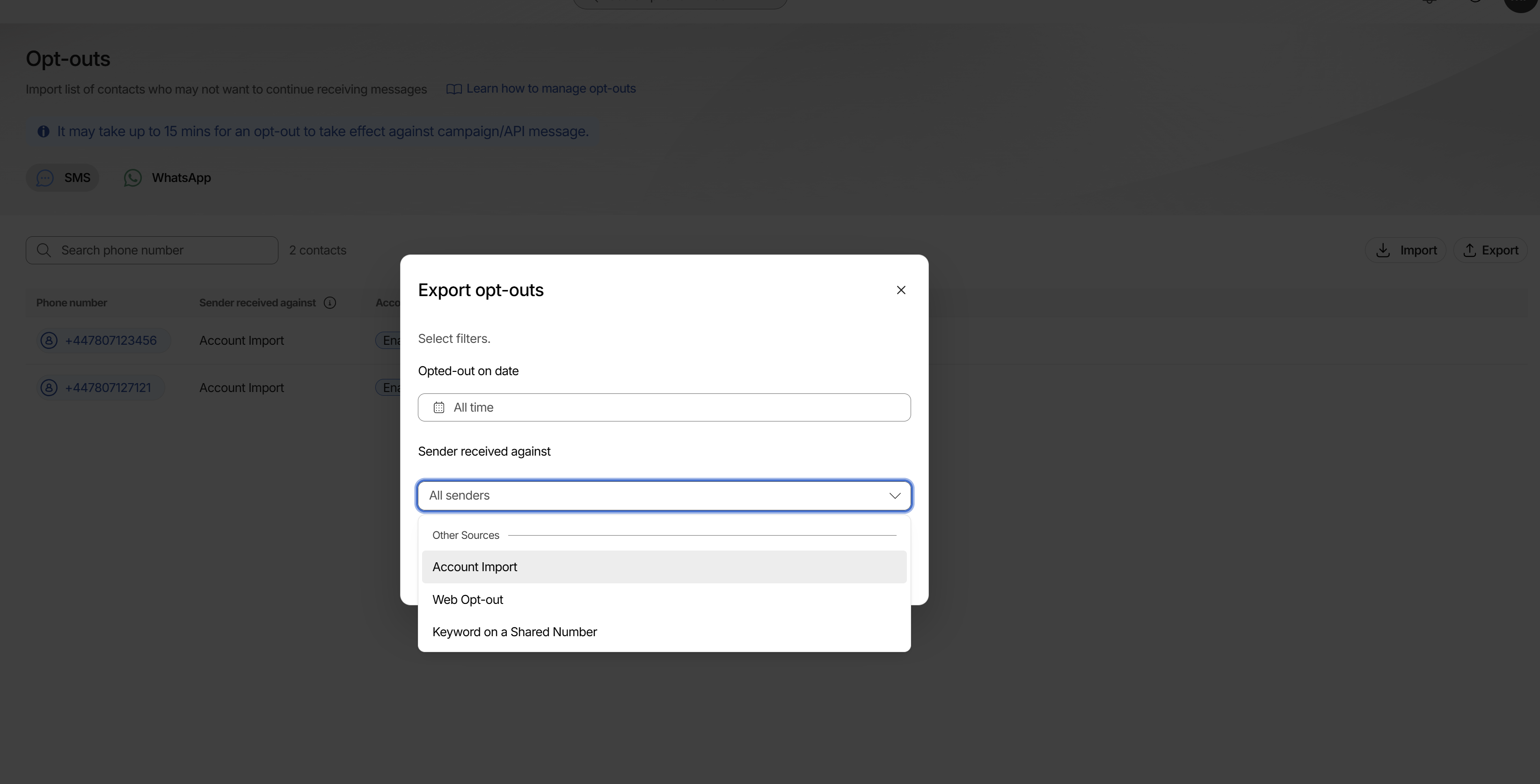 Manage your compliance data more effectively with the new Export functionality for Opt-outs. You can now generate CSV exports of your opt-out lists with granular filtering options, including date ranges and specific sender IDs. Exports are processed asynchronously and delivered via the notifications tray.