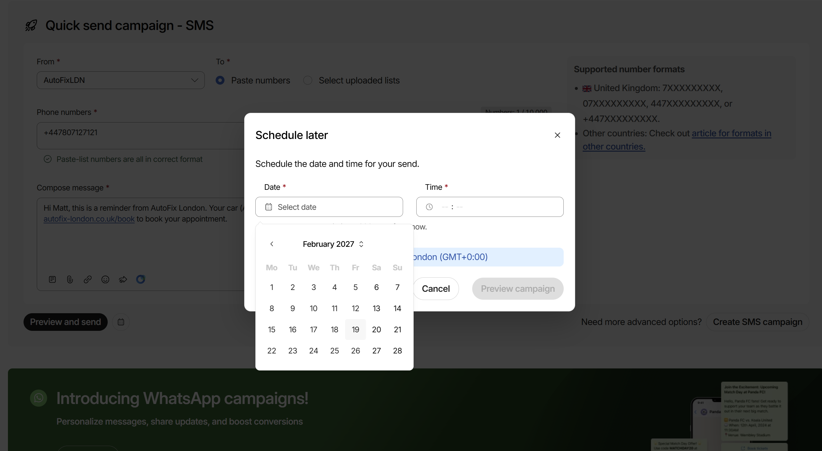 Plan your communication strategy further in advance. You can now schedule SMS campaigns up to 390 days into the future directly from the UI, aligning the dashboard capabilities with our API limits.