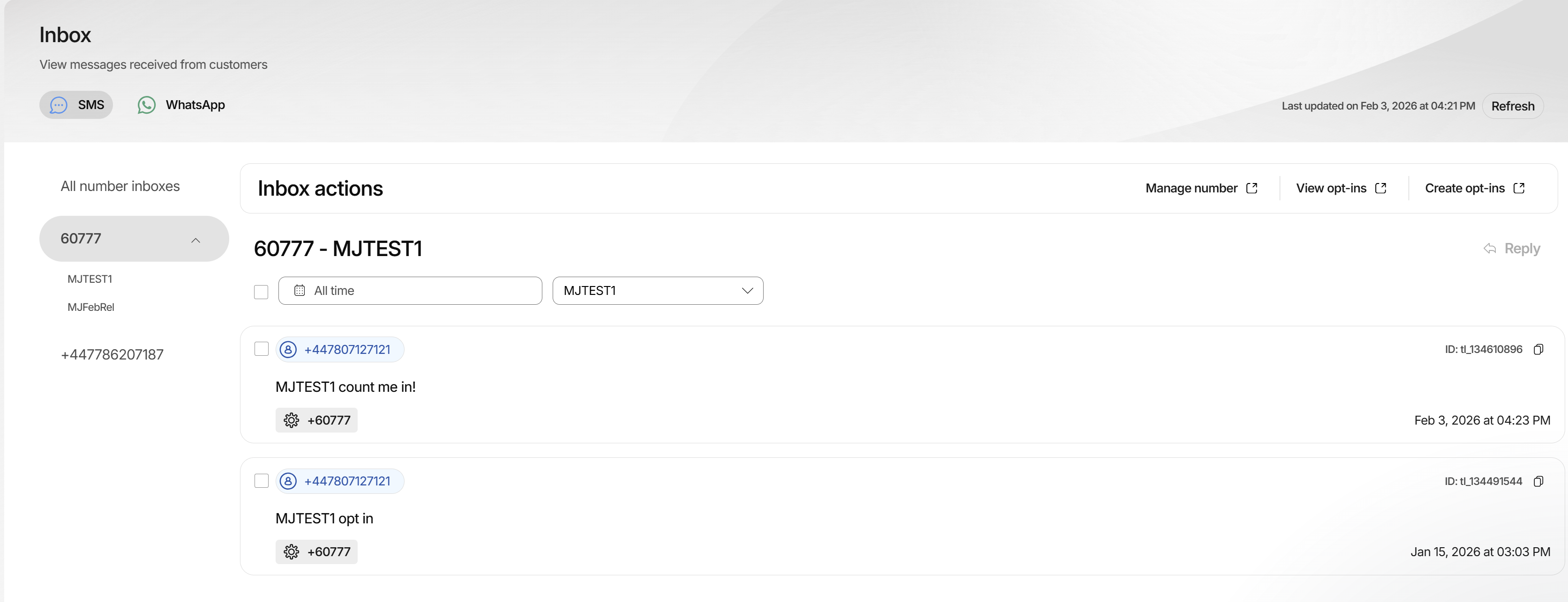 Inbox Filtering: Resolved an issue where messages sent to dedicated shortcodes or specific keywords on shared shortcodes were visible in the global view but disappeared when specific filters were applied.