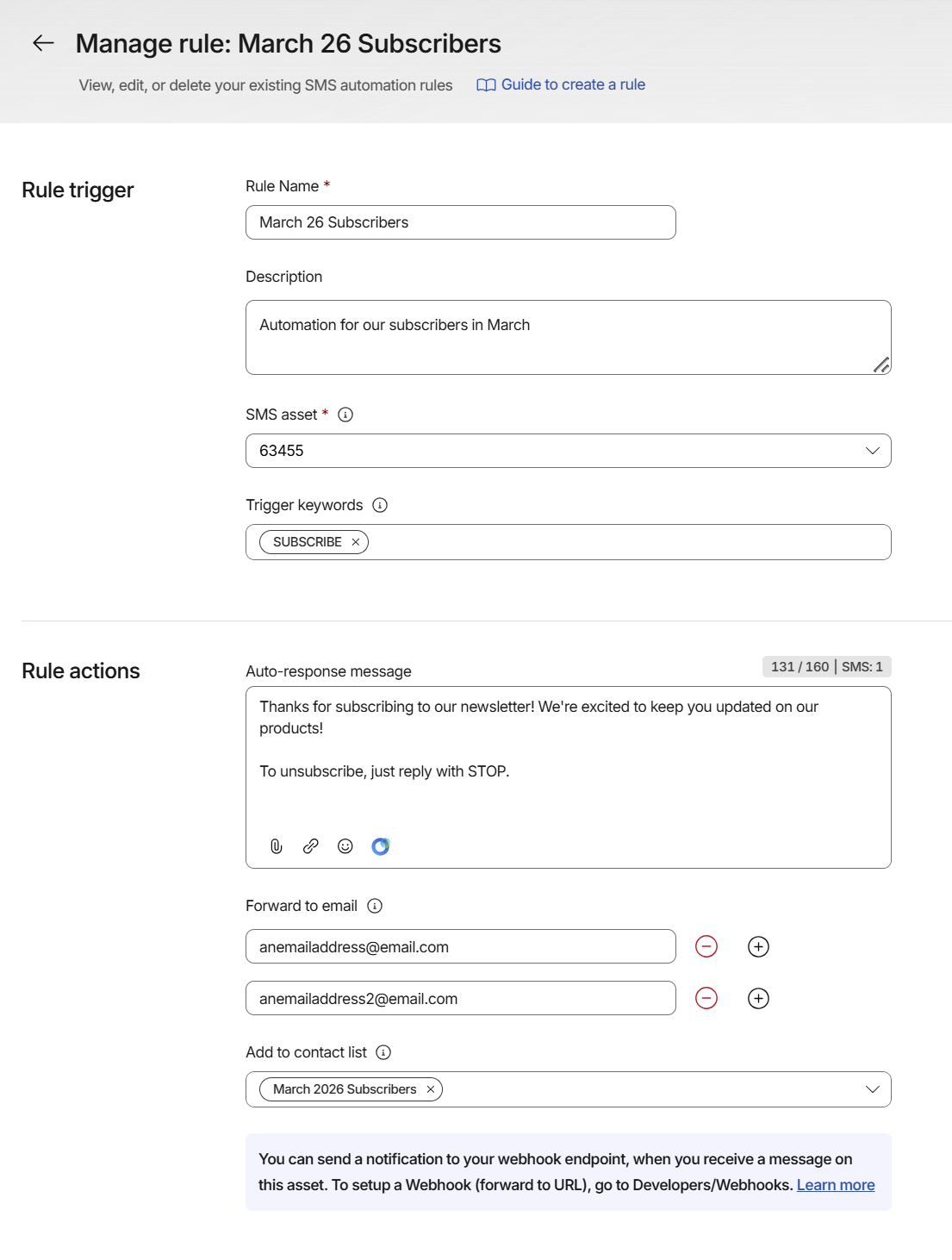 Whether you need to manage subscriber opt-ins and opt-outs, send automated SMS replies, or forward incoming messages to your team via email, Rules provides a flexible and extensible automation framework.
