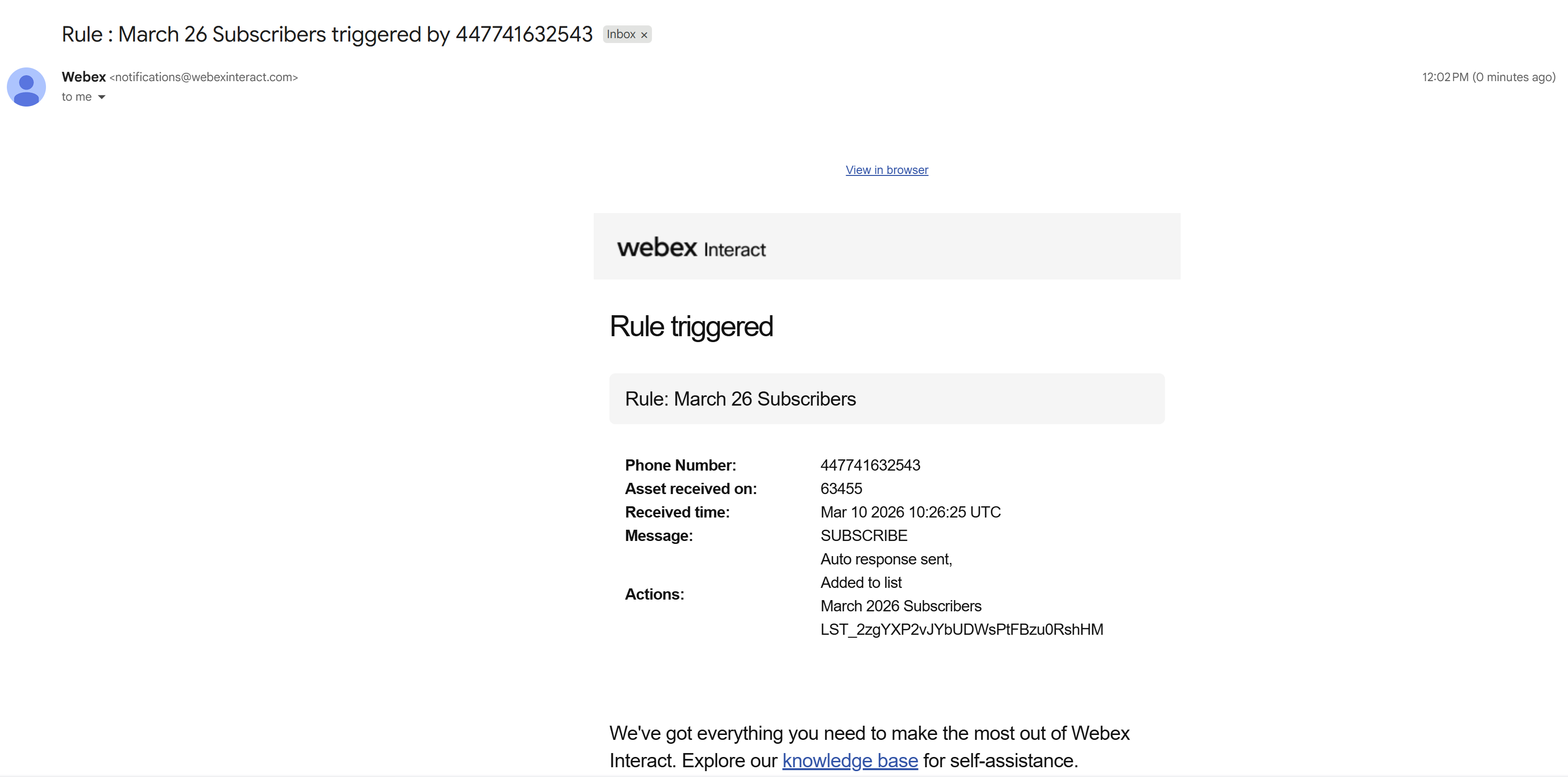 - The Actions taken by the system (e.g., "Auto response sent, Added to list...")