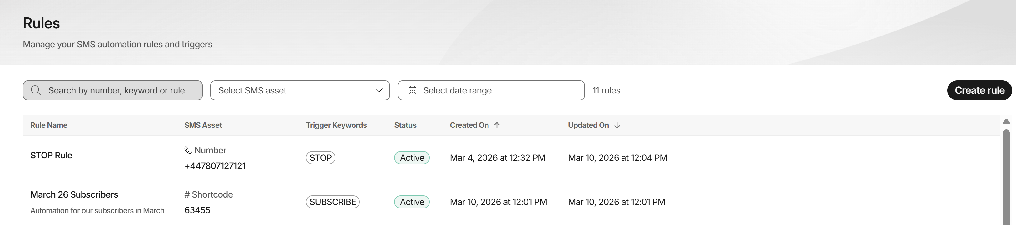 - Shared Assets (Keyword on Shared Number/Shortcode): You can add one additional keyword to the rule. Because the message must first be routed to your account via the primary asset keyword (e.g., WIN on 60777), the rule will only trigger if both the asset keyword AND the rule keyword are present in the message.